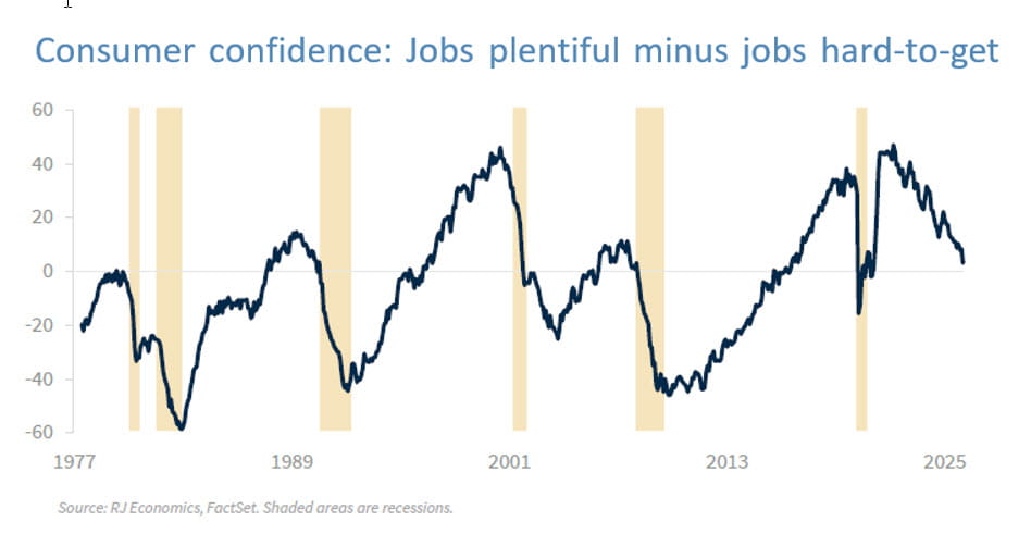 Americans have been concerned with the state of the US labor market for a while, but this concern accelerated at the beginning of 2025, with the difference between “jobs plentiful” minus “jobs hard to get” reaching the lowest level in January of this year and since the COVID pandemic recession, as shown in the graph below.